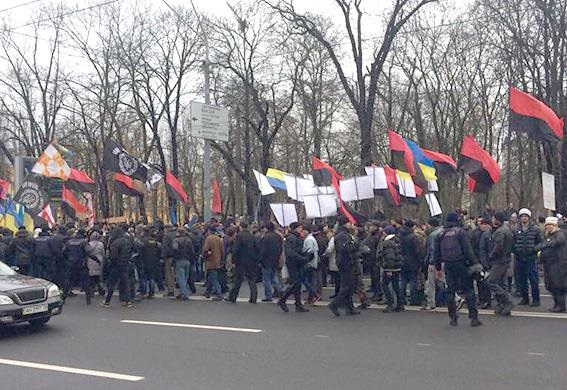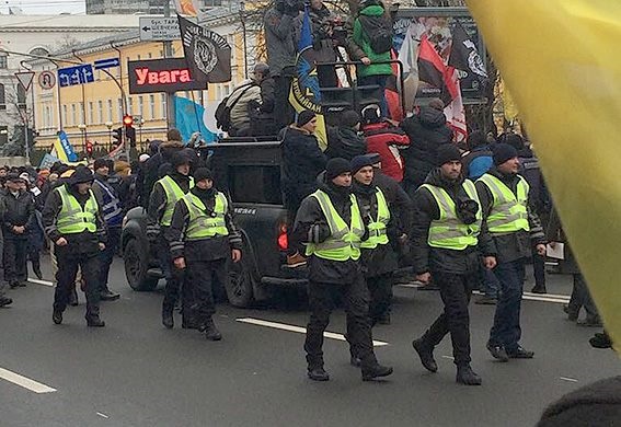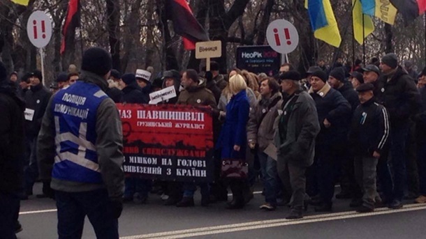 Колону возглавлял Саакашвили. Митингующие скандировали лозунги "Импичмент", "Нет коррупции, нет Порошенко", "Банду прочь, прочь барыг", "Импичмент вместо революции", "Вместе нас много, нас не преодолеть", "Киев — вставай".