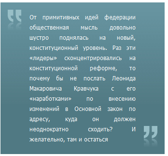 От примитивных идей федерации общественная мысль довольно шустро поднялась на новый, конституционный уровень. Раз эти «лидеры» сконцентрировались на конституционной реформе, то почему бы не послать Леонида Макаровича Кравчука с его «наработками» по внесению изменений в Основной закон по адресу, куда он должен неоднократно сходить? И желательно, там и остаться.
