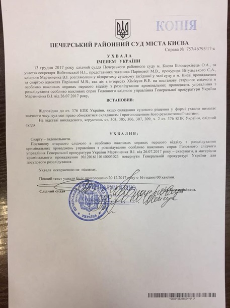 Об этом сообщил экс-замглава Администрации президента, юрист Андрей Портнов в Facebook. Он также опубликовал копию постановления Печерского районного суда Киева.