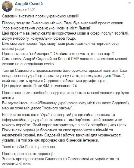 "Такие действия Садового являются продолжением его русификаторской политики. Уже неоднократно украинцы обращали внимание на то, что медиахолдинг "Люкс", который принадлежит жене Садового занимается русификацией. Это и радиостанция Люкс ФМ и телеканал 24. Однако столь позорного поведения, как саботаж языкового постановления, не стоило и ожидать. Вы вдумайтесь, в самом русскоязычном городе (как говорит Садовый), мэр не хочет местного "языкового закона"", — пишет Смолий в Facebook.