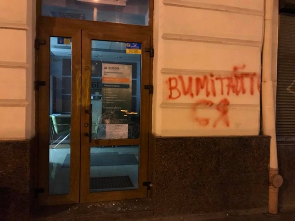 Во Львове разбили окна и двери, разрисовали фасад отделения Сбербанка России.
