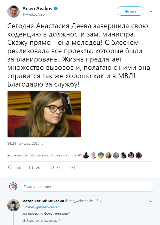 Украинский кабинет министров уволил подчинённую министра внутренних дел Арсена Авакова 25-летнюю Анастасию Дееву. Сообщается, что заместитель по вопросам европейской интеграции написала заявление по собственному желанию.