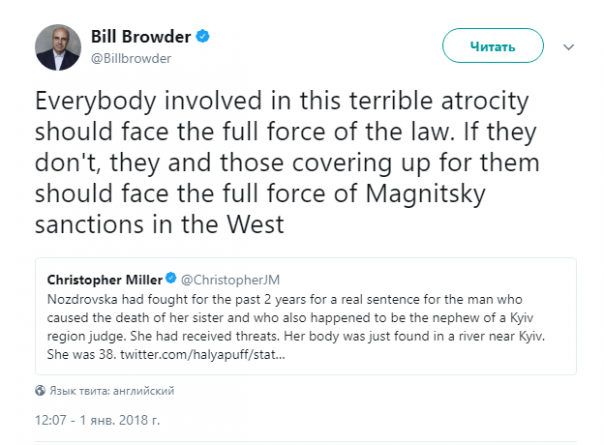 Однако первым на убийство отреагировал британский предприниматель и инициатор "Акта Магнитского" Билл Браудер, пригрозив Киеву санкциями.