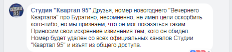 «Друзья, номер новогоднего «Вечернего Квартала» про Буратино, несомненно, не имел цели оскорбить кого-либо, но мы признаем, что он мог показаться таким. Приносим свои искренние извинения тем, кого он обидел. Номер будет удален со всех официальных каналов студии «Квартал 95″ и изъят из общего доступа», — говорится в сообщении.