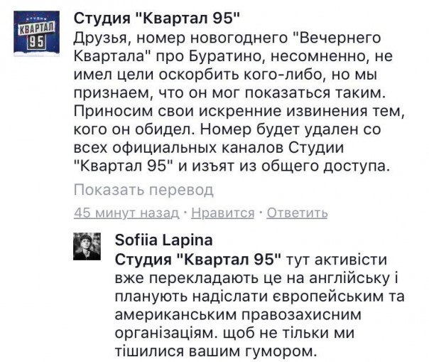 Вскоре после этого «Квартал 95» удалил ролик про Буратино, а канал «1+1» выступил с официальным заявлением относительно новогоднего выпуска «Вечернего квартала».