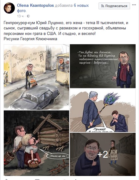«Генпрокурор-кум Юрий Луценко, его жена — тетка III тысячелетия, и сынок, сыгравший свадьбу с размахом и госохраной, объявлены персонами нон грата в США. И стыдно, и весело!», — заявила она.