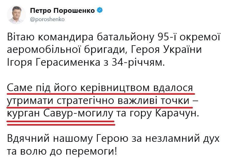 «Вот это новость! Оказывается, великие украинские военачальники до сих пор не сообщили Петру Порошенко о том, что Саур-могила с августа 2014 г. в руках дончан. А украинский главковерх все еще награды за ее "удержание" раздает!», - посмеялся в Facebook Владимир Корнилов.