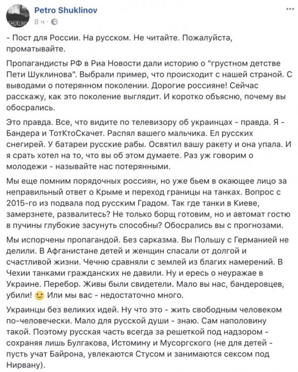 И, да! Просто для чистоты понимания. Россиянам в основной массе плевать на Украину и её молодое поколение. Просто потому, что они живут своими интересами. В которых украинцы воспринимаются исключительно как весьма проблемные соседи, внезапно ставшие весьма агрессивными, неприятными и неудобными.