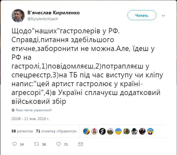 Украинский вице-премьер Вячеслав Кириленко предложил взимать военный сбор с артистов, которые собрались гастролировать на территории России. Об этом чиновник написал в своём твиттере