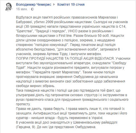 Также Чемерис пожаловался на то, что полиция безосновательно задержала одного из активистов Комитета 19 января Артема Тидву.