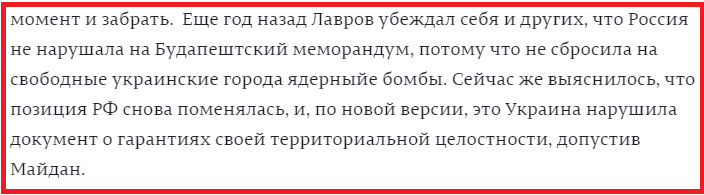 На самом же деле журналист лжет, что позиция России как-либо изменилась. На поставленный им вопрос (Цимбалюк сам задал вопрос, связанный с Будапештским меморандумом) министр иностранных дел РФ дал предельно четкий ответ, которой полностью соответствует изначально заявленной позиции Москвы на этот счет. Он лишь дополнил его для большей, так сказать, ясности пояснениями касательно событий на Майдане в 2013-2014 годах.
