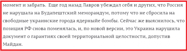 «Единственное, чего нет в Будапештском протоколе, это обязательства или обязанности России или кого бы там ни было ещё соглашаться с результатами антиконституционного вооруженного государственного переворота. Авторы которого первой своей акцией провозгласили борьбу с русским языком и борьбу с русскими в Крыму», — заявил глава внешнеполитического ведомства.