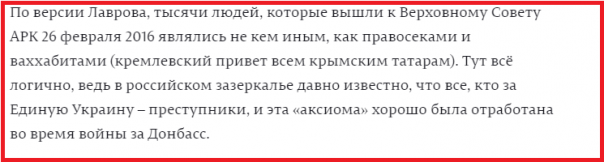В частности, глава МИД России напомнил Цимбалюку, как небезызвестный Дмитрий Ярош (один из наиболее радикальных и активных политических деятелей того периода) публично заявлял о том, что намеривается устроить этнические чистки в Крыму. Это действительно один из наиболее ярких примеров.