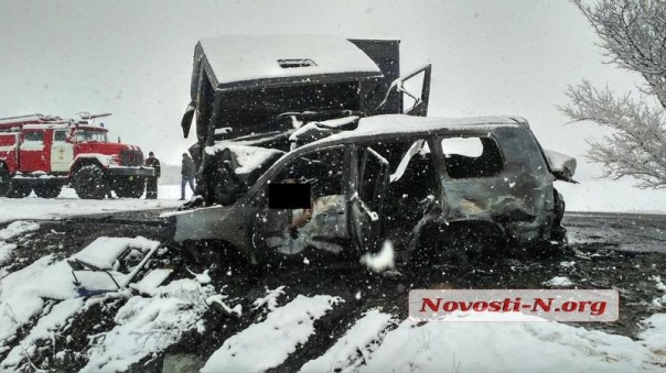 «Тойота» ехала по трассе со стороны Снигиревки, в направлении Николаева. По предварительным данным, на участке дороги возле села Партизанское из-за сложных погодных условий автомобиль занесло, он выехал на встречную полосу движения, где «лоб в лоб» столкнулся с двигавшимся навстречу КамАЗом. От мощного бокового удара внедорожник и кабину КамАЗа смяло, словно бумажный лист.