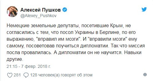 Глава комиссии Совета Федерации по информационной политике Алексей Пушков прокомментировал заявление посла Украины в Германии Андрея Мельника о том, что он «вправил мозги» немецким депутатам после их поездки в Крым. Как написал российский сенатор в своем микроблоге в Twitter, «миссия посла провалилась».