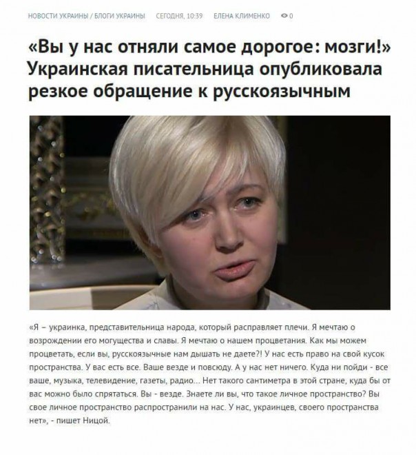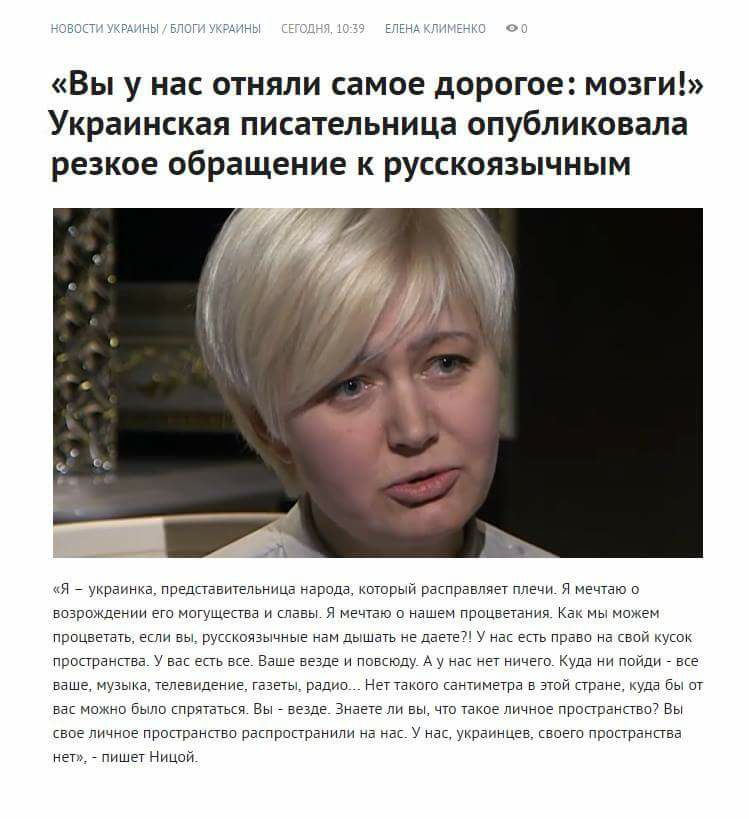 "Я - украинка. Я принадлежу к своему украинскому народу, расправляет плечи. Я мечтаю о возрождении его могущества и славы. Я мечтаю о нашем процветания. Как мы можем процветать, если вы (русскоязычные. – Ред.) нам дышать не даете?! Мы имеем право на свой кусок пространства. Своего, украинского. У вас есть все. Ваше везде и повсюду. У нас нет ничего. Куда ни пойди - все ваше, музыка, телевидение, газеты, радио... Нет такого сантиметра в этой стране, куда бы от вас можно было спрятаться. Вы - везде. Вы что-нибудь слышали о личном пространстве? Вы свое личное пространство распространили на нас. У нас, украинцев, своего пространства нет", - пишет Ницой.