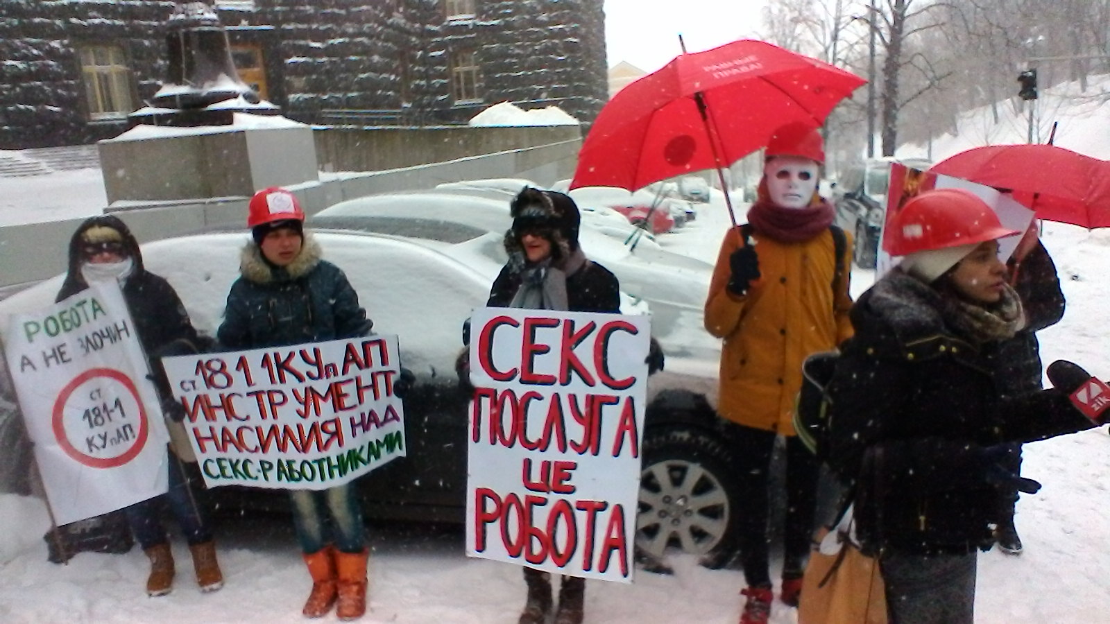 Несмотря на сильный мороз и тяжелый снегопад, в центре Киева прошла яркая акция секс-работников под названием «Стальные яйца украинской политики». Несколько десятков активистов потребовали от ведущих политиков страны декриминализировать проституцию – хотя бы потому, что «политическая проституция в стране давно легализована».