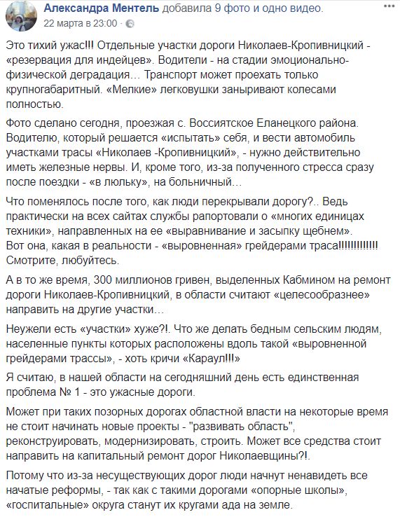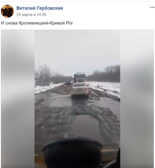"Это тихий ужас! Отдельные участки дороги Николаев – Кропивницкий – "резервация для индейцев". Водители – на стадии эмоционально-физической деградации… Транспорт может проехать только крупногабаритный. "Мелкие" легковушки заныривают колесами полностью.