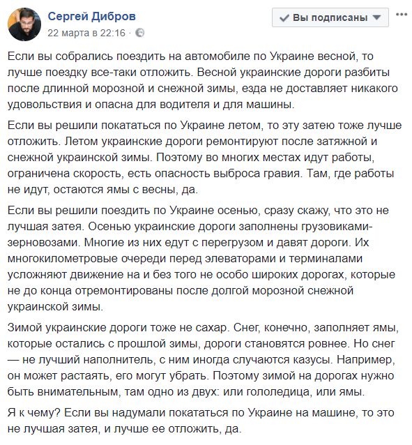 Одессит Сергей Дибров написал ироничный пост, в котором объясняет, почему нет идеального времени для езды по украинским дорогам.