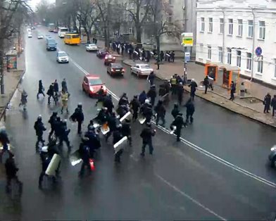 После того как митингующие прорвали оборону бойцов ВР и оттеснили их к Европейской площади, активисты сумели оттеснить нескольких бойцов ВВ от общей колонны, которая отступала до Грушевского, окружили стражей и избили их. Потом взяли в плен и силой повели на Майдан.