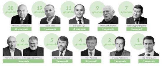 Из них 267 принадлежат госкомпаниям, а 204 обладают 114 частных компании. По расчетам журналистов «Украинской правды» (УП), одиннадцать публичных деятелей Украины обладают четвертой частью (107) всех выданных в стране нефтегазовых разрешений (из 474). Это пять крупнейших олигархов страны: И. Коломойский, Г. Боголюбов, В. Пинчук, Р. Ахметов, П. Фукс. К ним примыкает экс-министр Н. Злочевский и пять народных депутатов, капиталы и соответствующее влияние которых помельче: В. Новинский, И. Котвицкий, Л. Козаченко, Е. Звягильский и скандально известный А. Онищенко.