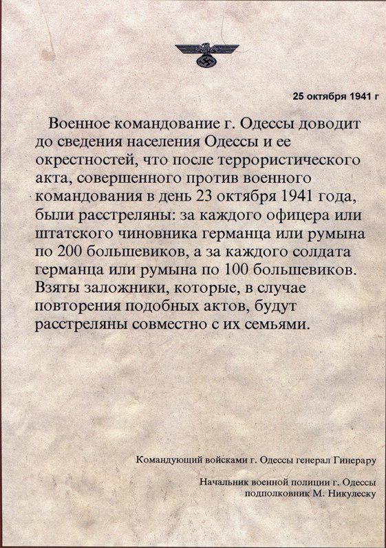 А после того, как была взорвана румынская комендатура на Маразлиевской — начались тотальные облавы и репрессии. Прохожих хватали на улицах и убивали. В пороховые склады на Люстдорфской дороге согнали 25 тысяч евреев и советских военнопленных, и были они заживо сожжены румынскими палачами. А дальше — пошла работать бесчеловечная мясорубка сбора тех же евреев в гетто, и высылка их в лютые лагеря смерти в Доманевке. Беляевке, Богдановке… Всего же было убито и замучено за годы оккупации порядка 100 тысяч человек!