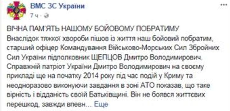 В командовании Военно-морских сил не уточнили, когда и в результате чего скончался старший офицер командования Военно-морских сил ВСУ подполковник Дмитрий Щепцов.