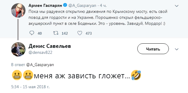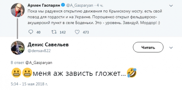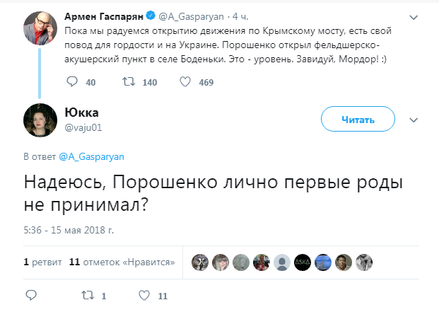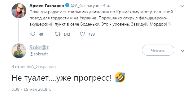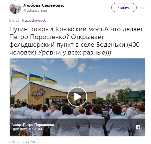 "Путин открыл Крымский мост. А что делает Петро Порошенко? Открывает фельдшерский пункт в селе Боденьки.(400 человек) Уровни у всех разные" — написала @Lubanya_Sem.