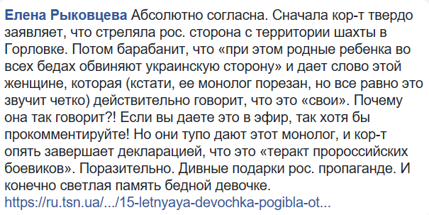 "Абсолютно согласна. Сначала корреспондент твердо заявляет, что стреляла российская сторона с территории шахты в Горловке. Потом барабанит, что "при этом родные ребенка во всех бедах обвиняют украинскую сторону" и дает слово этой женщине, которая (кстати, ее монолог порезан, но все равно это звучит четко) действительно говорит, что это "свои". Почему она так говорит?! Если вы даете это в эфир, так хотя бы прокомментируйте! Но они тупо дают этот монолог, и кор-т опять завершает декларацией, что это "теракт пророссийских боевиков". Поразительно".