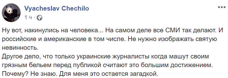 Другое дело, что только украинские журналисты когда машут своим грязным бельем перед публикой считают это большим достижением. Почему? Не знаю. Для меня это остается загадкой", - говорит журналист Вячеслав Чечило.
