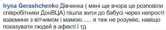 "Девочка (мне еще вчера это рассказали сотрудники ДонВГА) ушла жить к бабушке через непростые взаимоотношения с отчимом и мамой. Я тоже не понимаю, зачем показывать людей в аффекте", - написала она.