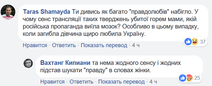 Помощник нардепа Анны Гопко Тарас Шамайда не понимает, "в чем смысл трансляции таких утверждений убитой горем мамы, которой российская пропаганда съела мозг? Особенно в том случае, когда погибшая девушка искренне любила Украину".