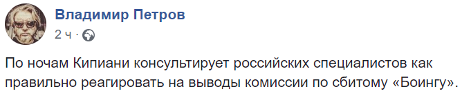 "По ночам Кипиани консультирует российских специалистов как правильно реагировать на выводы комиссии по сбитому "Боингу", - иронизирует шоумен Владимир Петров.
