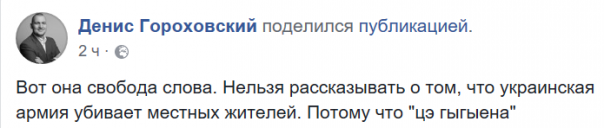 "Вот она свобода слова. Нельзя рассказывать о том, что украинская армия убивает местных жителей. Потому что "цэ гыгыена"", - пишет блогер Денис Гороховский.