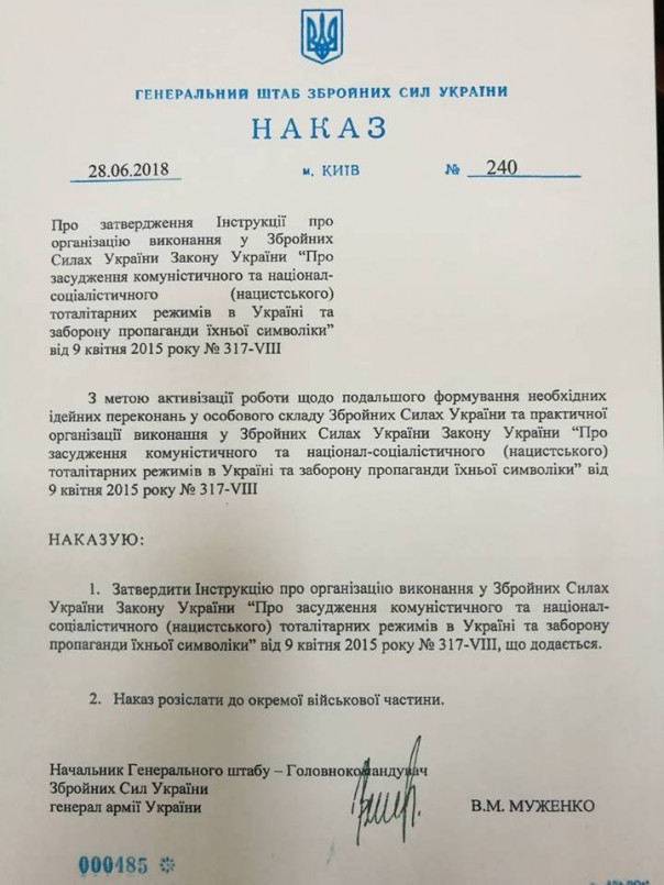 По его словам, документ четко регламентирует выполнение командирами и начальниками всех уровней управления Закона Украины "Об осуждении коммунистического и национал-социалистического (нацистского) тоталитарных режимов в Украине и запрете их символики".
