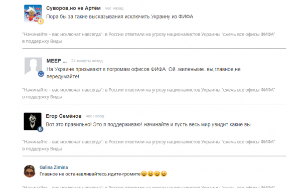 С агрессивным призывом в адрес ФИФА выступил лидер украинской националистической группировки "Братство" (запрещена в России) Дмитрий Корчинский. По его словам, Международная федерация футбола вынесением Виде официального предупреждения якобы продемонстрировала, что считает лозунг "Слава Украине" экстремистским по аналогии с прославлением немецких нацистов. "Если бы он сказал "слава России" или "слава Хорватии", уверен, ничего бы не было", - посетовал Корчинский.
