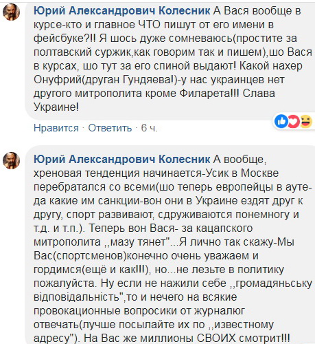 “А вообще, хреновая тенденция начинается, – продолжает Колесник. – Усик в Москве перебратался со всеми (шо теперь европейцы в ауте-да какие им санкции – вон они в Украине ездят друг к другу, спорт развивают, сдруживаются понемногу и т.д. и т.п.). Теперь вон Вася- за кацапского митрополита ,”мазу тянет”. Я лично так скажу. Мы Вас (спортсменов), конечно, очень уважаем и гордимся(ещё и как!), но не лезьте в политику, пожалуйста. Ну если не нажили себе “громадяньську вiдповiдальнiсть”, то и нечего на всякие провокационные вопросики от журналюг отвечать (лучше посылайте их по “известному адресу”). На Вас же миллионы СВОИХ смотрит!”.