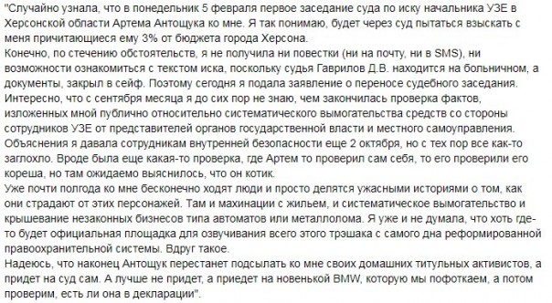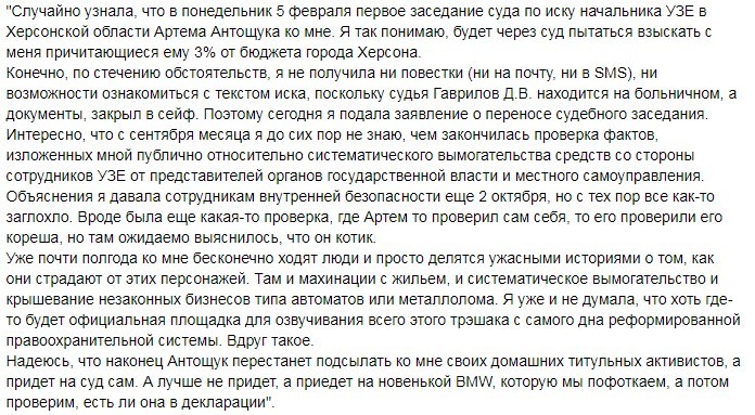 А вот скандал с начальником областного Управления защиты экономики Артемом Антощуком, который длиться еще с зимы 2018 года, более похож на правду, в особенности после публикации этой скандалистки поста в фейсбуке: