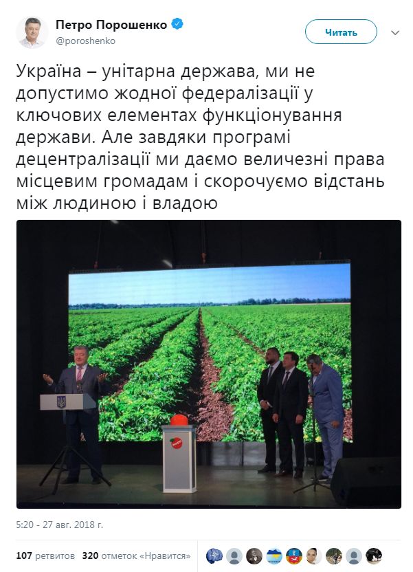 Президент Украины Пётр Порошенко заявил, что Незалежная останется унитарным государством и он со своей стороны не допустит федерализации страны. Соответствующая запись появилась сегодня в его "твиттере".