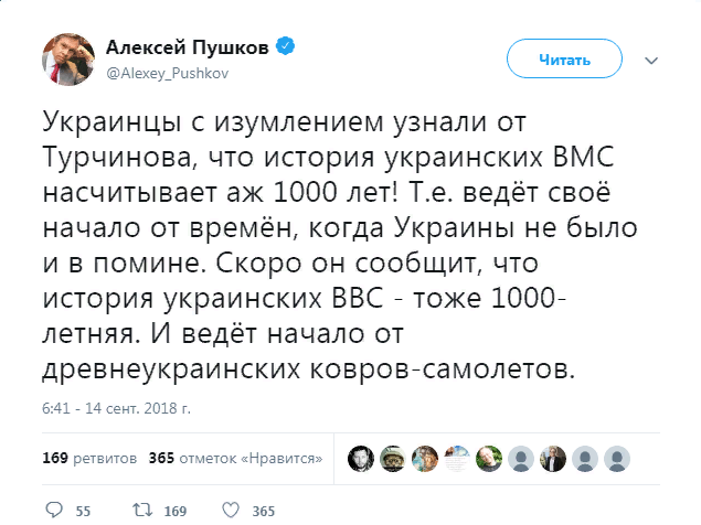 "Украинцы с изумлением узнали от Турчинова, что история украинских ВМС насчитывает аж 1000 лет! Т.е. ведет свое начало от времен, когда Украины не было и в помине. Скоро он сообщит, что история украинских ВВС — тоже 1000-летняя. И ведет начало от древнеукраинских ковров-самолетов", — написал Пушков у себя в Twitter.