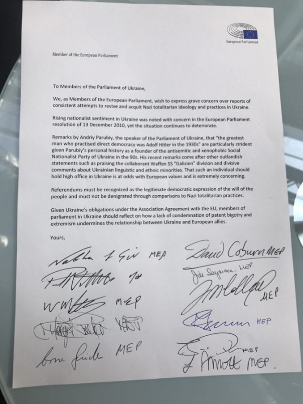 После его слов такое началось, что и вообразить трудно. И дома, и за рубежом. Лидер партии «За жизнь» Вадим Рабинович пообещал похоронить Парубия в суде. Оппозиционеры в Раде начали готовить отставку гитлеролюбивого спикера, а один из вождей «Оппоблока» Александр Вилкул рассказал, что депутаты Европарламента в Страсбурге начали сбор подписей под обращением к Верховной Раде Украины. С призывом дать объективную политическую оценку взглядам и заявлениям спикера Парубия и гнать его взашей. Сбор подписей еще продолжается, но под обращением уже поставили свои подписи члены Европарламента из Великобритании, Германии, Чехии и Польши, в том числе Арне Герике (Германия), евродепутаты от Великобритании Девид Коберн, Нейтан Джилл, Пол Нуттолл, Джейн Коллинз, Марго Паркер, Джилл Сеймур, Джонатан Арнот, Иржи Пайн (Чехия), Роберт Ивашкевич (Польша) и прочие гитлерофобы.
