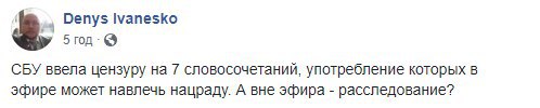Журналист Денис Иванеско:" СБУ ввела цензуру на 7 словосочетаний, употребление которых в эфире может навлечь нацраду. А вне эфира - расследование?" Источник