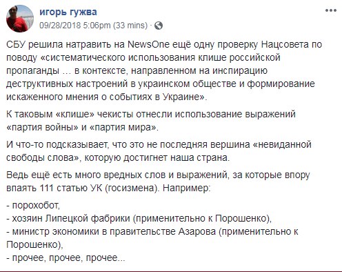 СБУ решила натравить на NewsOne ещё одну проверку Нацсовета по поводу "систематического использования клише российской пропаганды … в контексте, направленном на инспирацию деструктивных настроений в украинском обществе и формирование искаженного мнения о событиях в Украине". К таковым "клише" чекисты отнесли использование выражений "партия войны" и "партия мира". И что-то подсказывает, что это не последняя вершина "невиданной свободы слова", которую достигнет наша страна. Ведь ещё есть много вредных слов и выражений, за которые впору впаять 111 статью УК (госизмена). Например: - порохобот, - хозяин Липецкой фабрики (применительно к Порошенко), - министр экономики в правительстве Азарова (применительно к Порошенко), - прочее, прочее, прочее..."