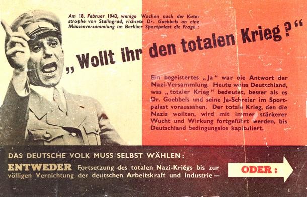«Люди, что сражаются с нашей пехотой... не знают церкви, христианства, западноевропейской культуры, цивилизации. Они уступают нам в вооружении, руководстве и как раса... Вот что верно для нашей пропаганды: если мы обращаемся к русскому народу, то даже самая малая доза проникает много глубже, чем большие дозы в отношении народа, управляемого демократически», — утверждал Геббельс.