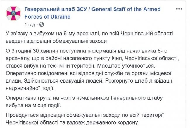 Интенсивность взрывов на шестом арсенале склада с боеприпасами в районе населенного пункта Ичня Черниговской области составляет два-три раза в секунду, сообщили в Генштабе Вооруженных сил Украины.