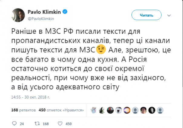 Украинский министр написал в Twitter, что "ранее в МИД России писали тексты для пропагандистских каналов, теперь эти каналы пишут тексты для МИД".