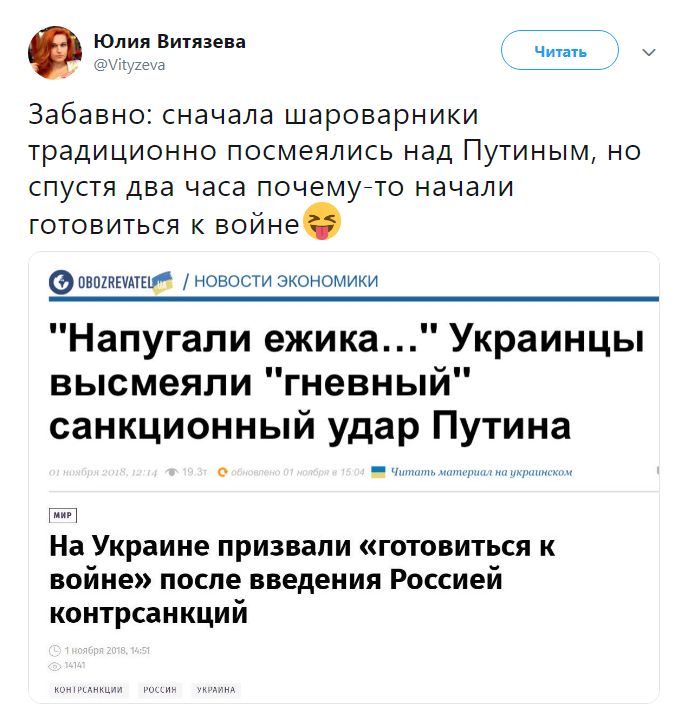 То, что нам про этот заводик пока не рассказали — так санкции ввели не для нас с вами. С учётом того, что Украина стала окончательно невменяемой, именно накануне выборов Россия послала свой горячий привет каждому игроку на предвыборной арене и дала понять, что теперь у них есть два варианта: или начать проявлять хоть какую-то адекватность, либо продолжать делать козью морду и в итоге потерять всё. Ведь в/на стать «агентом Кремля» и как следствие — попасть под каток народного гнева можно и за меньшие прегрешения.