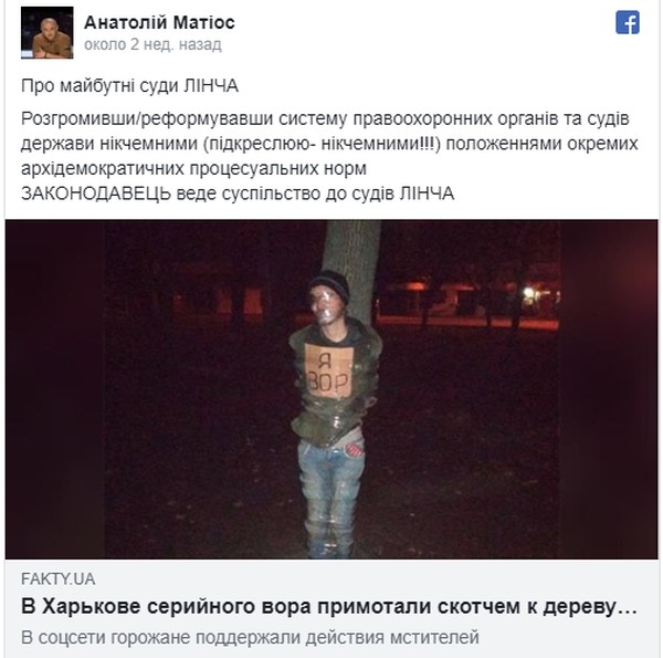 «О будущих судах Линча. Разгромив/реформировав систему правоохранительных органов и судов государства ничтожными (подчеркиваю - ничтожными!!!) положениями отдельных архидемократичных процессуальных норм, законодатель ведет общество к судам Линча». А это - цитата главного военного прокурора Украины Анатолия Матиоса, подлинность которой мы подтверждаем: