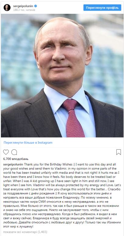 "Спасибо за поздравления с днем рождения. Я хочу воспользоваться этим днем и направить все ваши добрые пожелания Владимиру. По моему мнению, в некоторых частях мира СМИ относятся к нему несправедливо, а это неправильно. Мне больно от этого, так как я был раньше в таком же положении и знаю по себе это ощущение. Никто не заслуживает того, чтобы с ним обращались плохо или несправедливо", — заявил Полунин, добавив к написанному фото Владимира Путина.