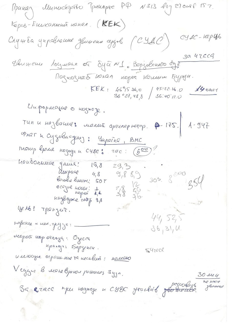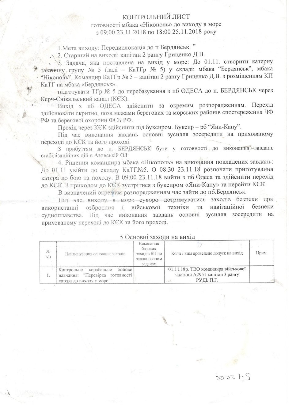Кроме того, на том же катере обнаружили рукописный конспект установленных Россией правил плавания по Керченско-Еникальскому каналу. Из этого следует, что украинские моряки были хорошо осведомлены о порядке его прохождения.
